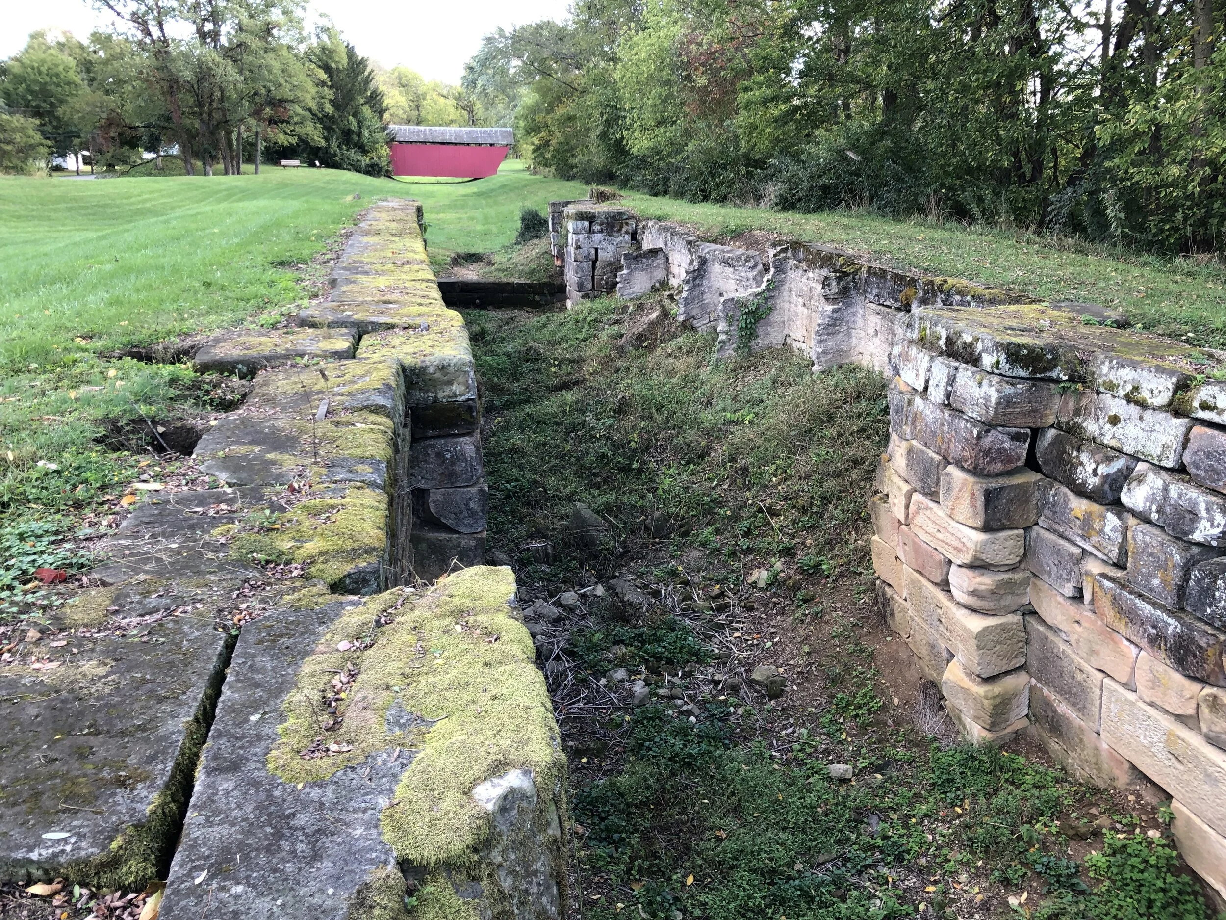 Over the weekend, The Captain and I had occasion to visit a group of locks on the old Ohio and Erie Canal. After an afternoon of looking at covered bridges, we made one last stop at the Lockville Park in Fairfield County, Ohio, to see the Hartman No. 2 Covered Bridge. Driving up to the park, we exited the car and there they were, under the shade of some old trees, surrounded by soon to be harvested corn fields, with no water to be seen, the South 11, 12, and 13 locks. The 8 acre park contained the covered bridge The Captain was after, but the locks were the real show. After walking up and down the old tow path, taking in the cut stone and earthworks, and the covered bridge, we headed home for dinner and the first internet deep-dive on the Ohio canals. The following is a preview of rabbit hole I’ll be in this winter.