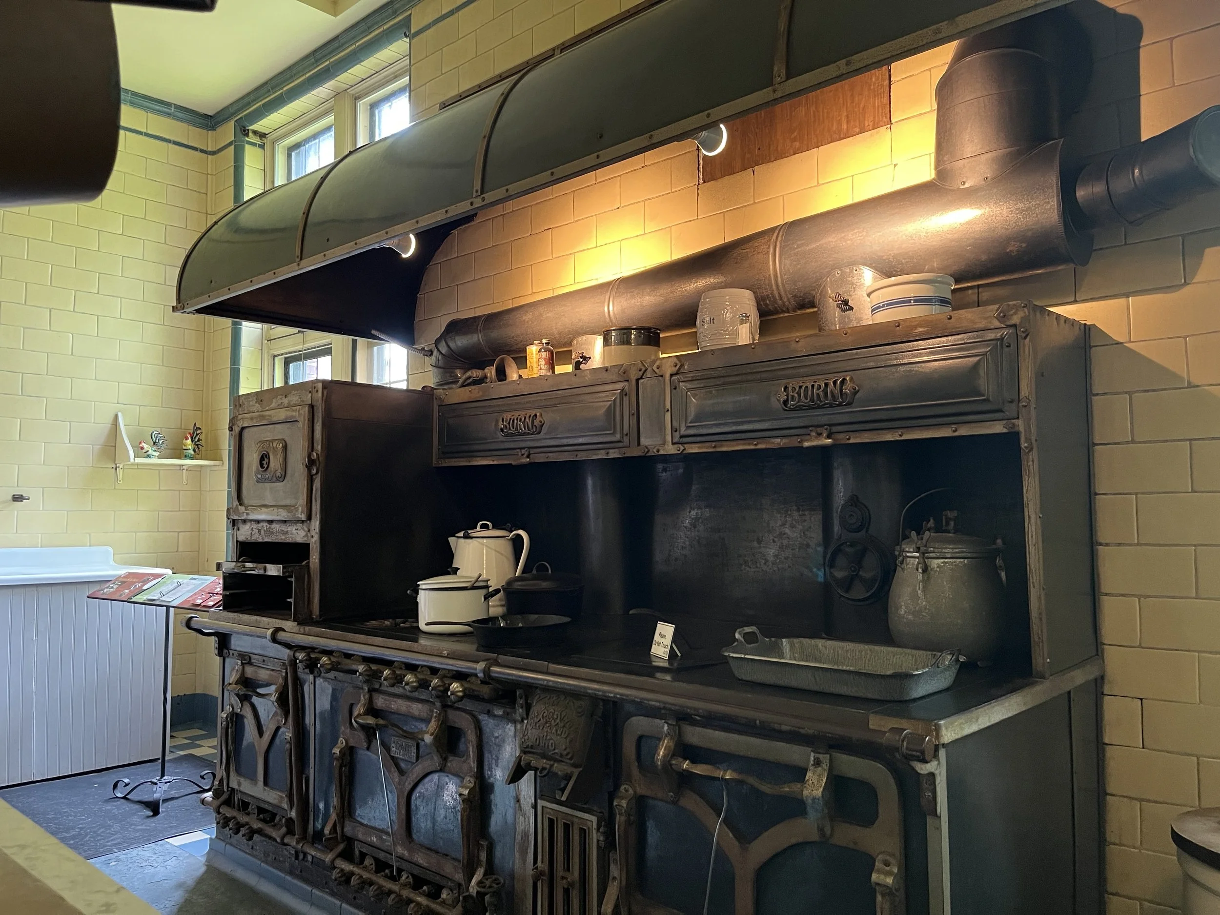 The dozens of staff were provided modern dorm style living in the house and all the greatest modern tools to facilitate their duties, like this massive multi-fuel range and oven.