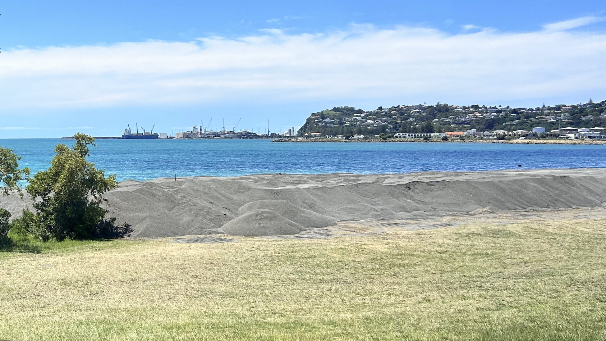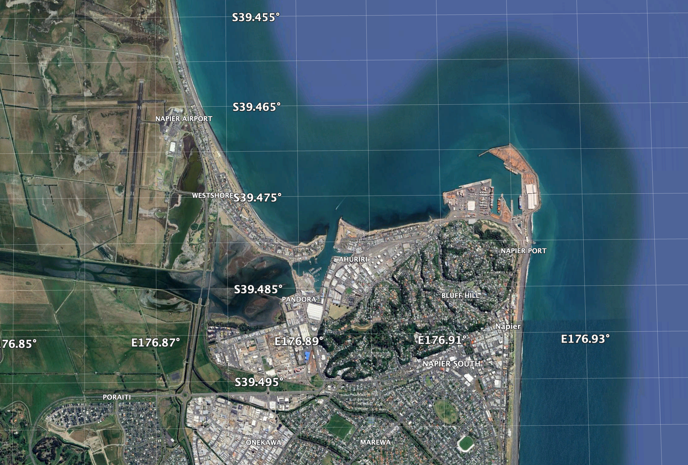 Looking southeast towards the new harbor across Hawke Bay, a reclamation project is putting new sand on the beaches. Outside of the central business district, the Art Deco gives way to old and new apartments and single family dwellings. Many of the neighborhoods are built on land lifted from the marshes by the 1931 quake. Some parts of the land rose by as much as two meters.