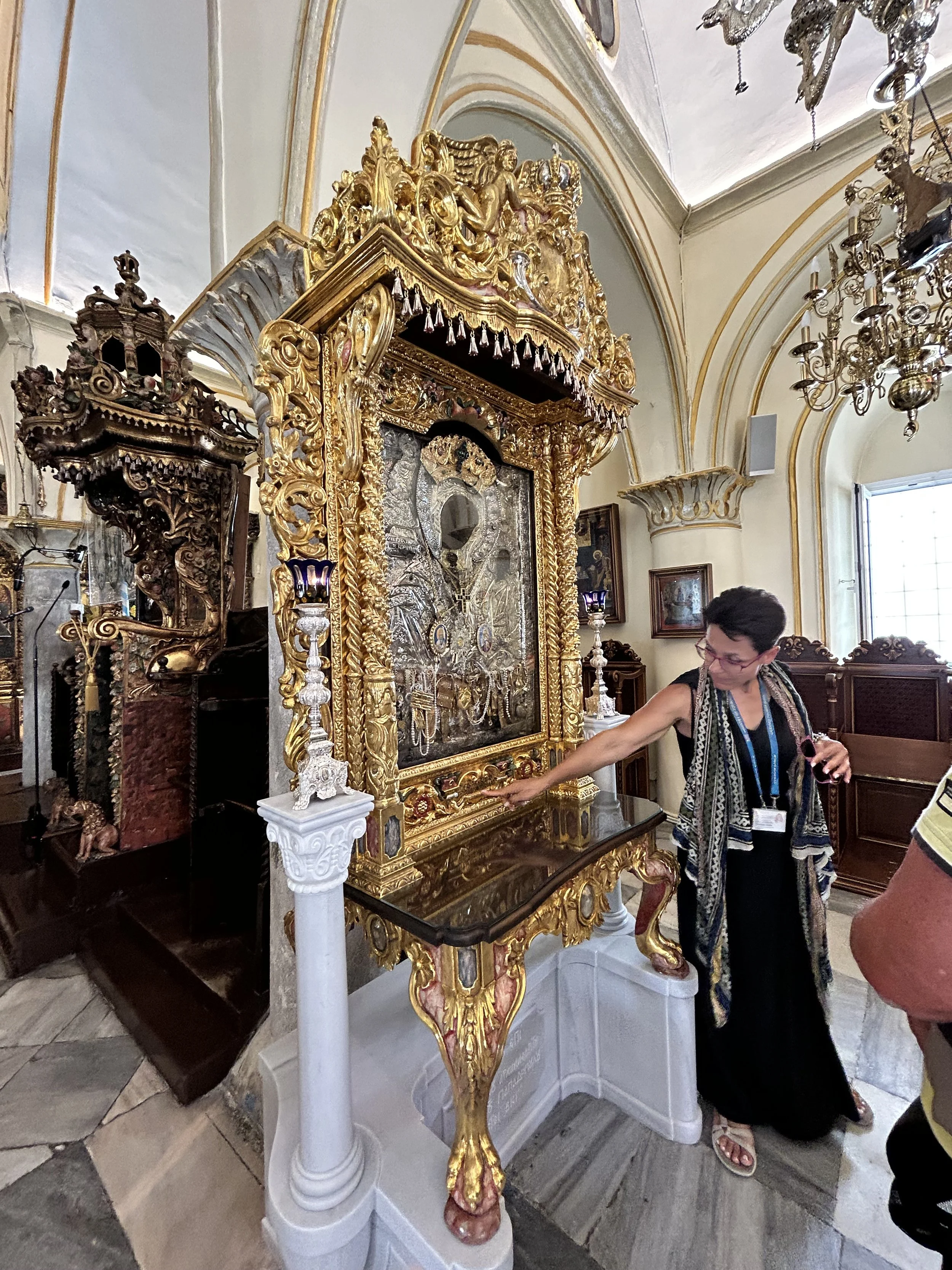Our guide explaining the sacred and miraculous Icon of the Virgin Mary. It was found floating in the sea some time before the church was built in 1542.