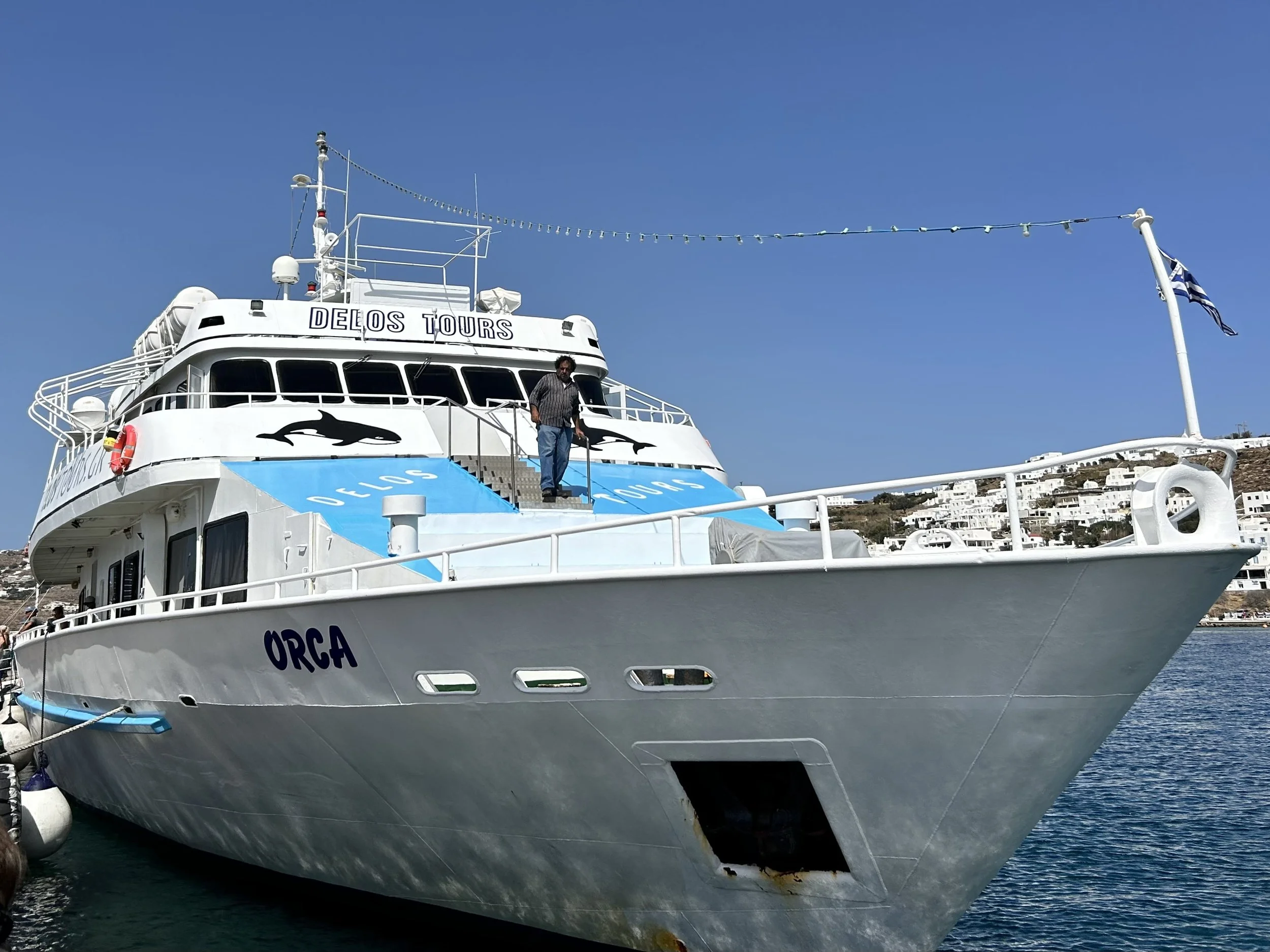 Our main objective for the day wasn’t Mykonos. It was actually the small island next door called Delos. Getting there requires a little planning and a boat ride. We booked a tour with a local guide and rode the M/V Orca to the Sacred Harbor of the ancient city of Delos.