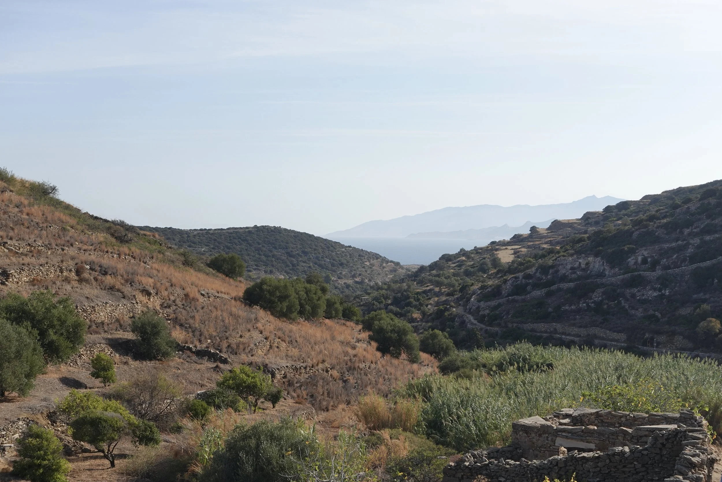 Leaving Lefkes, the road descends into a valley lined with stone walls and olive trees.